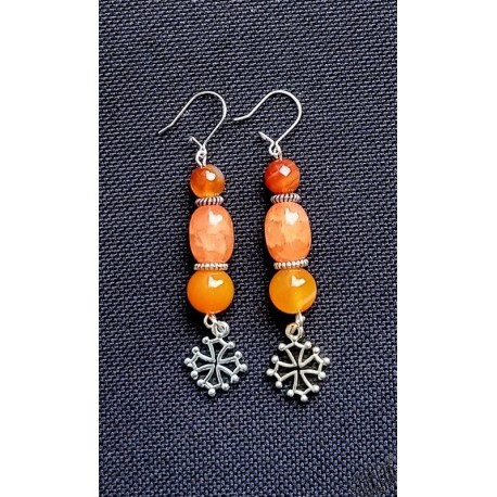 Boucles d'oreilles croix occitane avec perles de pierre naturelle et de verre. Attaches sans nickel. Hauteur totale boucle comprise 6cm.