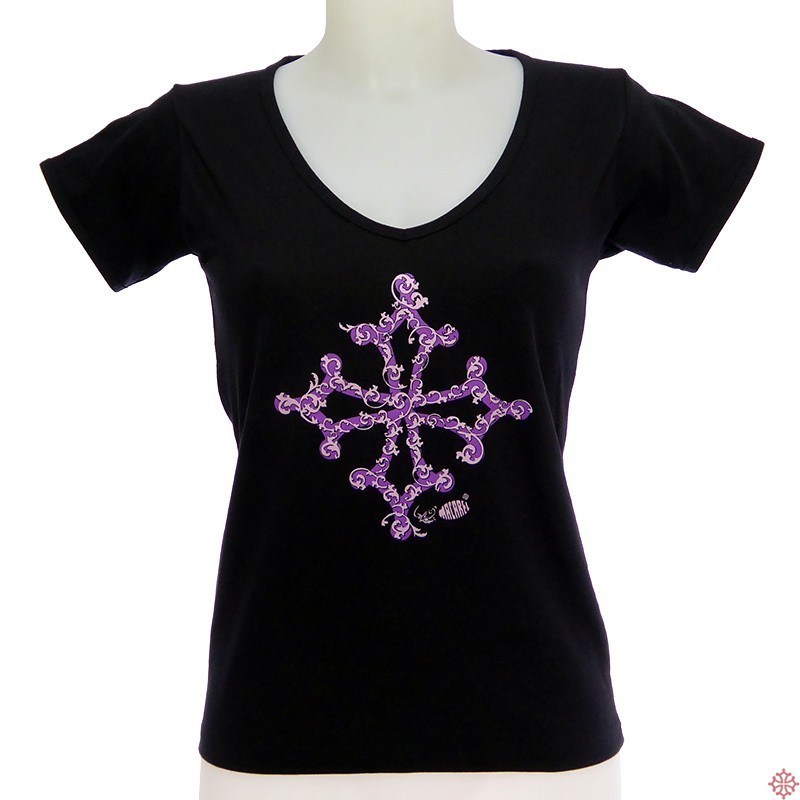 T-shirt décoré d'une belle croix occitane florale en dégradé de mauve par l'illustratrice Magali Rolgen.