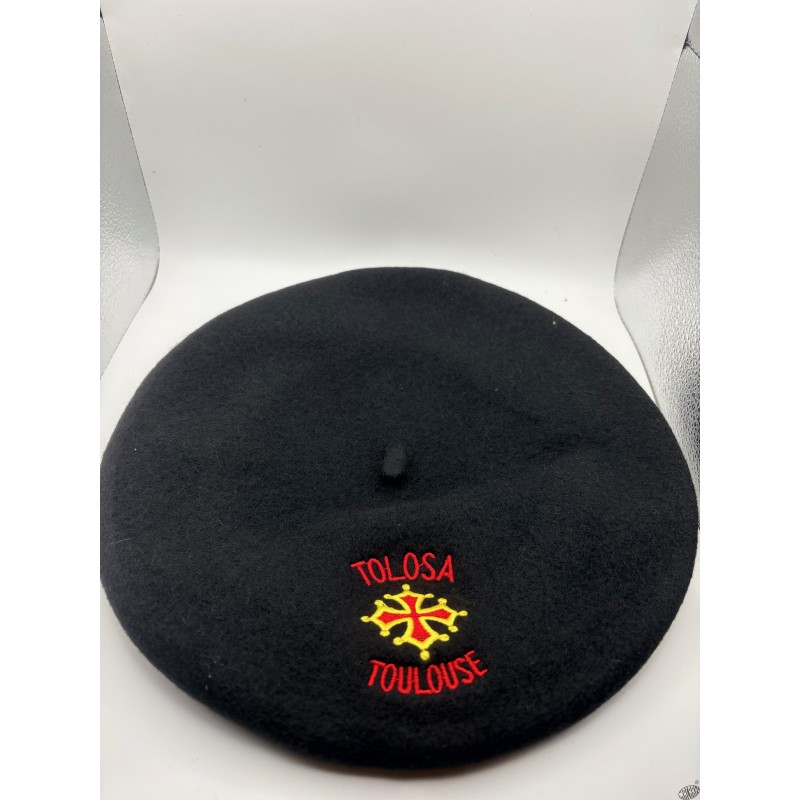 Ce béret séduira les Ariégeois à coup sûr . En laine 100%, coloris noir, il coiffe les têtes de 55cm à 59cm. Broderie croix occitane et Toulouse / Tolosa.