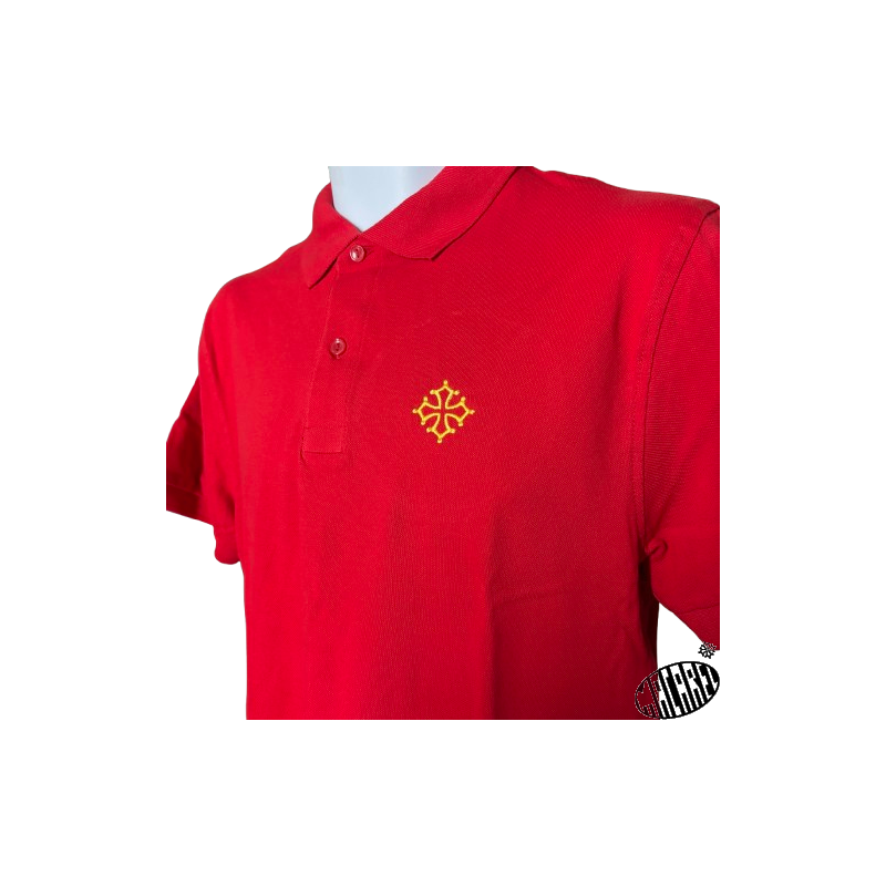 L'incontournable polo sobre et classe : rouge, 100% coton 200gr, manches courtes, col avec patte de boutonnage. Il porte, brodée sur le coeur, une croix occitane sang et or pleine.