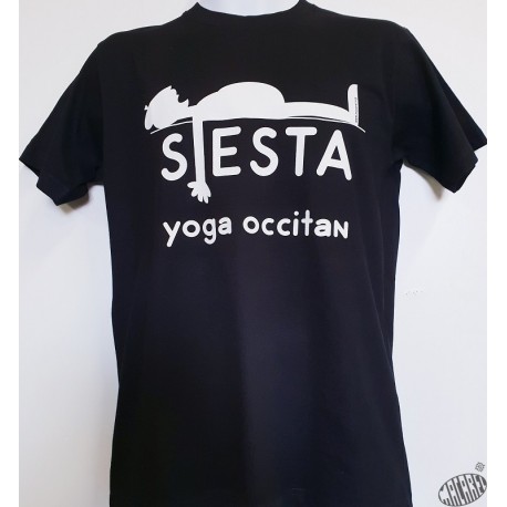 T-shirt Homme humour occitan Sièsta Yoga occitan. Coloris noir marquage blanc. En 100% coton peigné 190g.